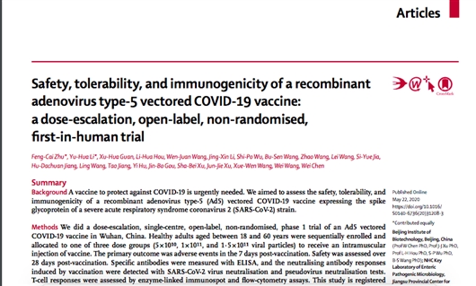 全球首个新冠疫苗人体临床试验结果发布?5月22日晚,《柳叶刀》在线发表全球首个新冠疫苗人体临床试验结果,显示重组腺病毒5型载体新冠疫苗在I期临床期间安全,并能在人体内产生针对新冠病毒的免疫应答。该试验结果来自军事科学院军事医学研究院生物工程研究所陈薇院士和江苏省疾控中心朱凤才教授团队。