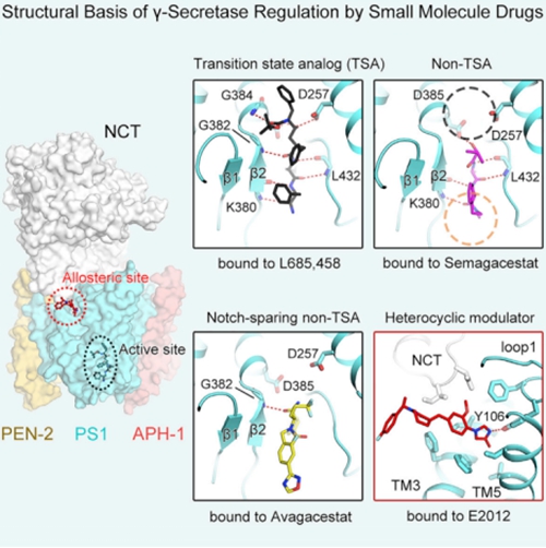 γ-分泌酶结合三种小分子抑制剂(Semagacestat、Avagacestat和L685,458)和一种调节剂(E2012)的原子分辨率冷冻电镜结构。(课题组供图)