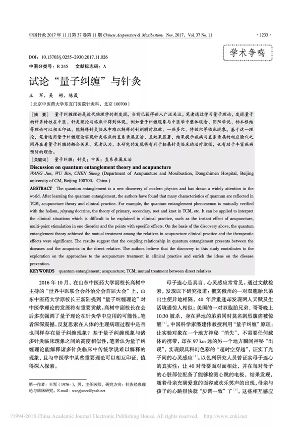 这篇文章在“中医基础理论的量子化解释”一章中,明确提出用量子纠缠理论解释经络理论。文章于2016年发表,早于“量子针灸”一文。