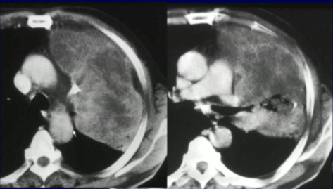 图5 克雷伯氏肺炎。中间可见有很多低密度改变,边界清楚,未越过叶间裂,肿瘤可以越过叶间裂,但炎症不太容易越过。